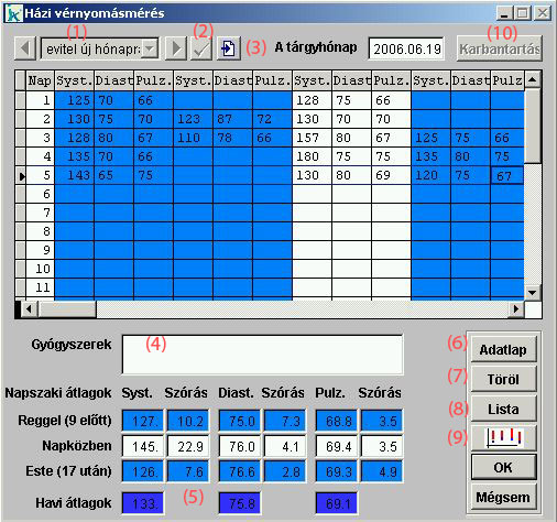 Ezzel a menüponttal az otthon elvégzett vérnyomásmérés adatokat lehet rögzíteni. Amennyiben a betegnek már volt korábbi mérése, a lap tetején található legördülő menüből (1), vagy a két oldalán látható nyilakkal kiválaszthatjuk azok valamelyikét, s ekkor az adott dátumhoz tartozó mérési lap tartalma betöltődik a házi vérnyomásmérés megfelelő rovataiba. Ezzel egyrészt áttekinthetjük a korábbi méréseket, másrészt a "pipa" nyomógombbal (2) módosítható formában beemelhetjük az adatlapra, s így egyszerűen módosíthatjuk a korábbi adatokat. Ha a kiválasztott vérnyomásmérést a "rendelések vérnyomás adatainak betöltése" nyomógombbal (3) emeljük be az adatlapba, akkor ezzel a rendeléseken elvégzett vérnyomásmérés adatok fognak szerepelni a megfelelő mezőkben. Amennyiben teljesen új házi vérnyomásmérést szeretnénk kitölteni, a legördülő menü alapértelmezett tartalmát (bevitel új hónapra) kell a "pipa" nyomógombbal kiválasztani. Az adatlapon lehet jelölni, hogy milyen gyógyszereket (4) szed a beteg, az egér jobb gombjával az ablakra kattintva lehet egy előre felvett készletről vagy a therápiás lapról kiválasztani a gyógyszereket. A táblázatba lehet beírni a mért eredményeket, melyekből a program automatikusan átlagokat (5) számol. Az "Adatlap" (6) nyomógombbal egy táblázatot lehet nyomtatni, ahová a páciens be tudja írni az otthon mért adatokat. A "Töröl" (7) gombbal lehet a már bevitt adatokat törölni. A " Lista" (8) nyomógombbal egy kis grafikont és egy táblázatot lehet elkészíteni, az elvégzett mérésekről, az alatta lévő nyomógombbal (9) egy nagyobb grafikont lehet készíteni. |