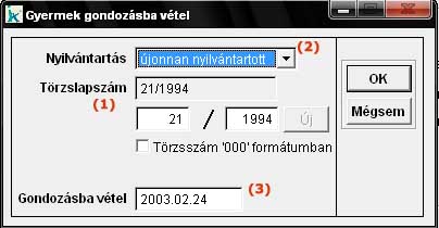 Ebben a menüpontban lehet a 13 évesnél fiatalabb pácienseket gondozásba venni. Kell egy nyilvántartási számot (1) adnunk, meg kell határozni, hogy milyen indokkal vettük nyilvántartásba (2) és a felvétel dátumát (3) is kitölthetjük. |