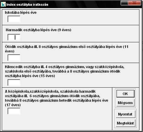 Ebben a menüpontban van lehetőség annak az évnek a megadására amikor a kiválasztott paciens (személyválasztás) belép az adott indexkategóriába. (Ezeket az adatokat a rendszer a statisztikák készítésénél használja) |