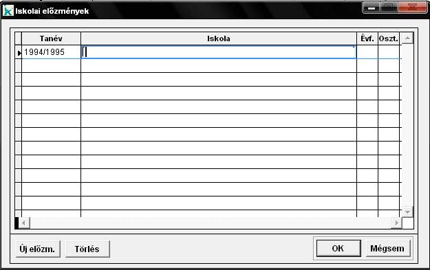 Iskolai előzmények rögzítésére szolgáló menüpont. Az 'Új előzm.' gombbal tudunk új előzményt felvinni. A Tanév oszlopban a lenyíló menüből válasszuk ki a tanévet. Majd az Iskola oszlopba írjujk be az iskolát, ez a mező jobb egérgombbal karbantartható. Ezután az évfolyamot és az osztályt kell megadnunk. A megfelelő soron állva a 'Töröl' gombbal tudjuk törölni az előzményt. |