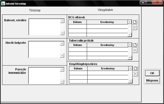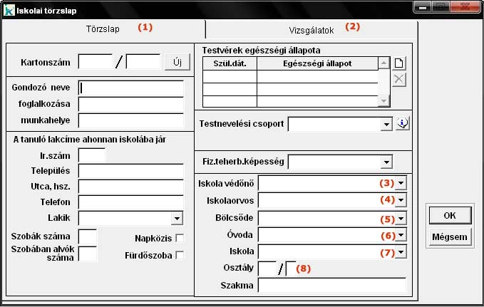 Ebben a menüpontban rögzíthetjük az iskola védőnőnek szükséges személyi adatokat (1) és vizsgálatokat (2). Az iskola védőnő (3), az iskolaorvos (4), a bölcsöde (5), az óvoda (6) és az iskola (7) mezőket ajánlatos kitölteni, mert az iskola védőnő által elkészíthető listák csak így lesznek hitelesek. |