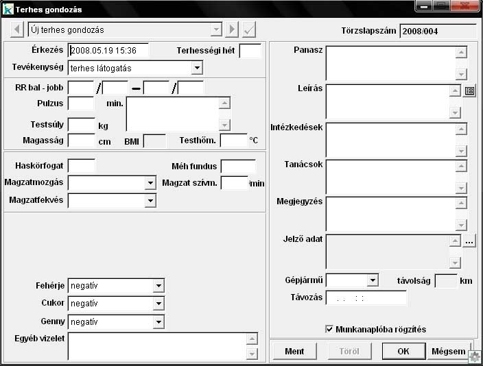 Ez a funkció dokumentálja a védőnő-terhes találkozásokat akár a terhes jelent meg a rendelésen, akár a védőnő ment a terheshez hívás, vagy látogatás céljából. Ezt a tablót minden esetben ki kell tölteni, mivel ez regisztrálja a forgalmat. Amennyiben a betegnek már volt korábbi megjelenése, a lap tetején található legördülő menüből (1), vagy a két oldalán látható nyilakkal kiválaszthatjuk azok valamelyikét, s ekkor az adott dátumhoz tartozó rendelési lap tartalma betöltődik a napi ellátás megfelelő rovataiba. Ezzel egyrészt áttekinthetjük a korábbi megjelenéseket, másrészt a "pipa" nyomógombbal (2) módosítható formában beemelhetjük az adatlapra, s így egyszerűen módosíthatjuk a korábbi adatokat, vagy törölhetjük az adott ellátást. Amennyiben teljesen új napi ellátást szeretnénk kitölteni, a legördülő menü alapértelmezett tartalmát (Új napi ellátás) kell a "pipa" nyomógombbal kiválasztani. Az érkezés dátuma kitöltődik a beállított munkadátumnak megfelelően, ezt azonban módosíthatjuk. Így tudunk korábban lezajlott találkozásokat dokumentálni (fontos, hogy forgalomként a munkadátumnak megfelelő dátum tárolódik, tehát a teljesen jó megoldás ebben az esetben a munkadátum állítása). A panasz, vizelet, megjegyzés és leírás mezőket (3) a szövegablakok fejezetben leírtak szerint tölthetjük ki. Az utolsó mezőhöz űrlapot is rendelhetünk az ablak melletti "adatlap" nyomógombbal. Ennek hatására, kinyílik az adott ablakhoz tartozó űrlap, vagy több űrlappal rendelkező ablak esetén az ablakban listaszerűen megjelennek az elérhető adatlap nevek. Ezek közül dupla kattintással választhatunk ki egyet, melynek hatására megnyílik az adatlap, s kitölthetjük azt. Egy szövegablakhoz egyszerre csak egy űrlap tölthető ki, de emellett maga a szövegablak is használható párhuzamosan. Ha valamely mezőhöz már tartozik kitöltött adatlap, akkor annak tartalmát szintén az "adatlap" nyomógombbal (4) nézhetjük meg. Azt, hogy van már űrlap kitöltve a nyomógomb színe jelzi. A jelző adat mező kitöltése a forgalmi adatokkal kapcsolatos listázásoknál nyújt szűkítési lehetőséget. A BMI-t a program automatikusan számolja a beírt testsúly és testmagasság alapján. Kiválasztható a látogatáshoz igénybe vett gépkocsi, és a távolság. A távozás ideje (5) az ablak bezárásakor automatikusan kitöltődik. Ha módosítani szeretnénk, kattintsunk a távozás mezőbe, ahova az aktuális időpont beíródik, ezután lehet módosítani. A többi mező kitöltése értelemszerű. |