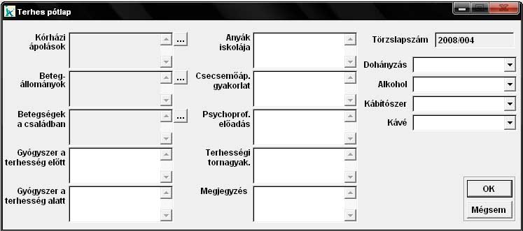 Ebben a menüben lehet rögzíteni a terhes kórházi kezeléseit, táppénzeit, családtagok betegségeit, a gyógyszerezéseit a terhesség előtt és alatt, anyák iskolája, csecsemőápolási gyakorlat, terhességi tornagyakorlat és a káros szenvedélyeit. |