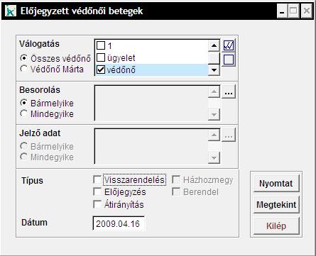 Ebben a menüpontban listázhatjuk ki az adott napra előjegyzett, és/vagy visszarendelt és/vagy átirányított betegek névsorát. A visszarendelt betegeknél lehetőség van a háznál és a rendelőben történt visszarendelések külön listázására is. |