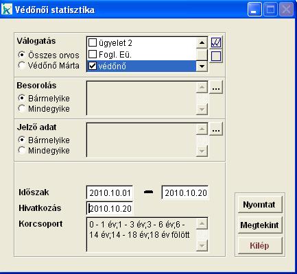 A védőnői látogatások számát tekinthetjük meg ebben a menüpontban, a megadott időszakra vonatkozóan, korcsoportos bontásban. A 'Válogatás' mezőben tudjuk megadni, hogy a tanácsadóban dolgozó összes védőnő gondozottjaira együtt, vagy csak az éppen bejelentkezett védőnőére készítjük el a listát. A lista szűkíthető a 'Besorolás', és a 'Jelző adat' mezőkkel a többes választék segítségével. |