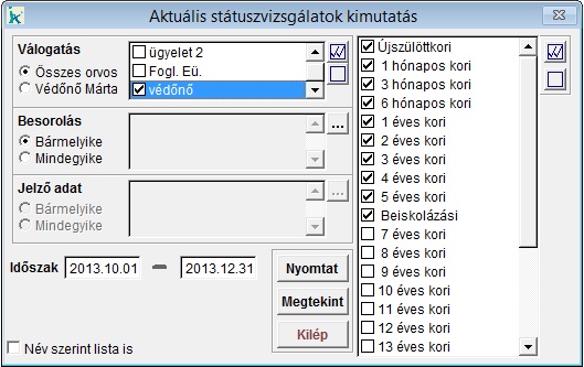 a listát név szerint is tételesen, ekkor a vizsgálat dátuma is látszik az elkészült listában, ehhez tegyünk pipát a 'Név szerinti lista is' opció elé. Megadhatjuk, hogy mely státuszok kerüljenek a listába. Jelőljük be azokat a vizsgálatokat, amelyeket a listában szeretnénk látni.