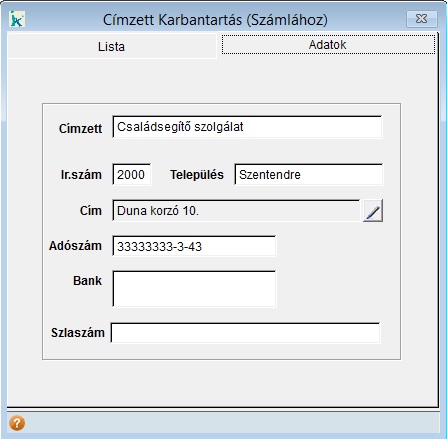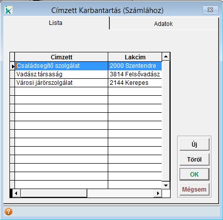 Az Új gomb segítségével a számlázáshoz tudunk címzetteket előre beállítani. Meglévő címzette, a Töröl gomb segítségével törölhetünk, az OK gomb megnyomásával zárhatjuk be az ablakot az adatok tárolásával. |
