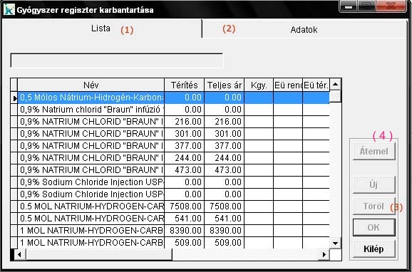 adatait, de nem módosíthatja azokat, és nem vehet fel új készítményeket. A lista ablakban (1) keressük meg a módosítani