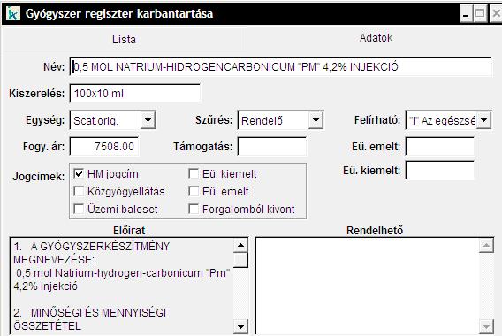 Ezután az adatok lapon a kiválasztott gyógyszer paramétereit megváltoztathatjuk. Új gyógyszer felvételéhez kattintsunk
