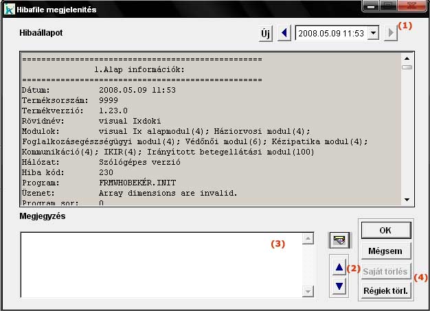 A program használata során előfordulhat, hogy rendszer működése, valamilyen oknál fogva megáll. Ekkor egy üzenet jelenik meg a képernyőn, amely megkérdezi, hogy a hiba állapot részletezése mentésre kerüljön-e. Erre a kérdésre az igen-t választva menthetjük el a hibaállapotot részletező leírást egy úgynevezett hibafájlba. Ezeket a hibajelzéseket mindig érdemes elmenteni, mert a szükséges program szervízelését, módosítását ezek alapján lehet a lehető leggyorsabban elvégezni. Rögtön a választás után újabb kérdés jelenik meg, mely arra vonatkozik, hogy a program használatát folytatjuk-e. Javasoljuk, hogy ilyen esetekben, lehetőleg lépjenek ki a programból. Ezzel az aktuális, nem tárolt adatok el fognak veszni. Választható az a megoldás is, hogy folytatjuk a program használatát, de ezekben az esetekben egy olyan állapotban használjuk a programot, amelyre a rendszer már nincs felkészítve, így előfordulhat, hogy újabb hibaüzenetet kapunk. Ezzel akár hibaüzenetek egész láncolatát indíthatjuk el, melyek mindaddig folytatódnak, amíg, egy a programunk számára kezelhető állapotot nem kapunk. Szerencsés esetben minden fennakadás nélkül folytathatjuk a munkát, szerencsétlen esetben akár komoly adatbázis sérülést is előidézhetünk így. A keletkezett hibafájlokat tekinthetjük meg ebben a menüpontban. A fájlok között az "előző" és "következő" nyomógombokkal válthatunk (1). Minden hibafájl fejezetekből áll, melyek közt a "fel" és "le" nyomógombokkal (2) kereshetünk. A hibákhoz egyedi megjegyzéseket (melyik menüpont használata közben, milyen körülmények között keletkezett) fűzhetünk (3). Az aktuális hibafájl a "töröl" nyomógombbal (4) törölhető (nem ajánlott). A program használata közbeni észrevételeinket, javaslatainkat is rögzíthetjük ebben a menüpontban, ehhez az "Új" feliratú gombot kell megnyomni. Ekkor a hibaállapotot részletező ablakunk üres lesz, és a megjegyzés ablakba írhatunk, majd az "OK" gombbal tárolhatjuk a beírt szöveget. |