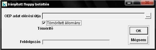 Az OEP-től kapott irány floppy betöltésére szolgáló menüpont. Válasszuk ki a kapott állományt, az elérési út mező mellett található '3 pontos' nyomógomb segítségével. Amennyiben ez az állomány egy tömörített állomány, akkor ezt a programnak is jeleznünk kell. Az OK gomb lenyomásának hatására elindul az adatok feldolgozása, melynek folyamatáról a Feldolgozás mezőben információt is kapunk. |