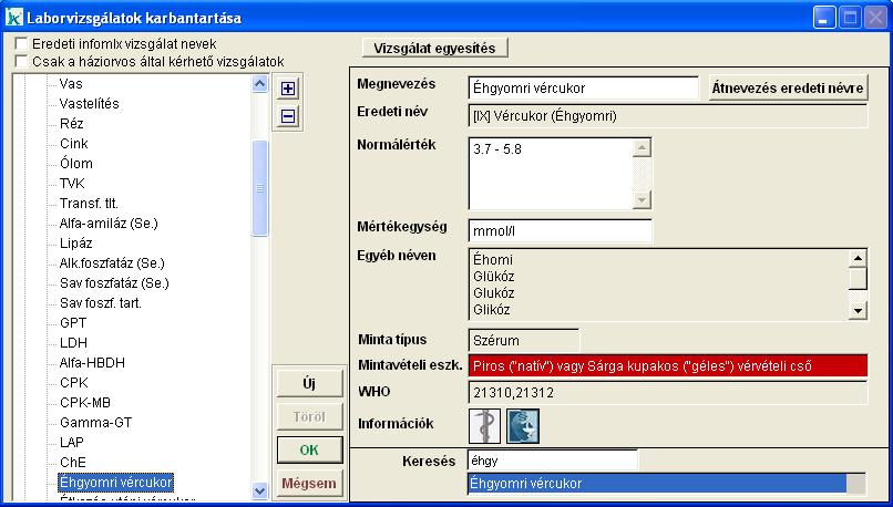 A 'Vizsgálat egyesítés' gomb segítségével egyesíthetünk meglévő vizsgálatokat. Ha egy laborvizsgálat többször szerepel az adatbázisunkban, akkor ezzel a funkcióval összefésülhetjük őket. Pl.: a felhasználó által felvett LDL Koleszterin vizsgálatot egyesítjük az infomixes LDL Koleszterin vizsgálattal. Minden meglévő eredmény és egyéb hivatkozás átáll az új vizsgálatra, a régi vizsgálatot pedig töröltre állítjuk.