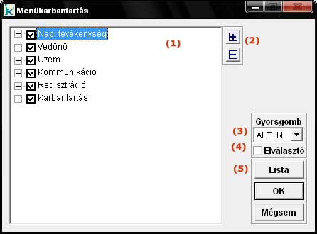 Ebben a menüpontban határozhatjuk meg, hogy az adott felhasználónál milyen menüpontok jelenjenek meg. A beállíthatóság a "Napi tevékenység", "Regisztráció" és a "Karbantartás" menüpontokra használható. Az ablak bal oldalán (1) látható a rendszerben elérhető összes menüpont. A főmenüpontok előtti + jelre kattintva megjelennek az almenüpontok. Az "összes" nyomógombbal (2) mindegyik főmenüpont alá tartozó almenü megjeleníthető. Azok a menüpontok fognak megjelenni a felhasználói felületen, amelyeknél a menüpont neve előtt található négyzet be van jelölve. Ha olyan menüpontot jelölünk be, amelynek vannak almenüpontjai, úgy annak összes almenüje automatikusan kiválasztásra kerül. A kiválasztott menüponthoz gyorsbillentyű rendelhető (3). Ez azt fogja eredményezni, hogy a menüponthoz tartozó akcióablak a lenyomott billentyűre azonnal elindul, s ehhez nem kell a menürendszerbe belépni. A véletlen indítások elkerülése érdekében érdemes mindig billentyűkombinációkat megadni (pl.: ALT+F2). A Windows által használt billentyű kombinációkat (pl. ALT+F4 - futó alkalmazás bezárása) érdemes elkerülni, mivel erre a billentyűkombinációra nem a kiválasztott menüpontunk fog elindulni, hanem a megfelelő Windows utasítás hajtódik végre. Ha az elválasztó kiválasztó négyzetet (4) bejelöljük, akkor a menüablakban egy vízszintes vonal fog megjelenni az aktuális menüpont fölött. Készíthetünk listát (5) is a beállított menüpontjainkról. Ebben a listában hierarchikus rendben jelennek meg a beállított menüpontjaink. A változtatásokat, beállításokat az "OK" gombbal tárolhatjuk, a "Mégsem" gombbal léphetünk ki ebből a funkcióból változtatások nélkül A Menüpontok karbantartása funkcióról egy részletes magyarázatot tartalmazó oktató videó érhető el a portálunkról az alábbi linkre kattintva: Menüpontok karbantartása . |
