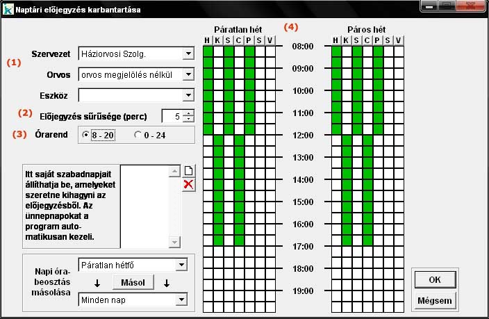 Ebben a menüpontban állítható be a betegek előjegyzéséhez és visszarendeléséhez használt naptár beosztása. Külön naptári beosztás készíthető minden egyes praxishoz illetve orvoshoz (1). Az előjegyzés gyakorisága (2) szabja meg, hogy a naptárba milyen időkülönbségekkel vehessünk fel bejegyzést (percekben). Az órarendnél választani lehet a 24 órás és a 12 órás felosztás között (3). Külön paraméterezhetjük a páros és páratlan heteket(4). Amennyiben megadjuk a rendelési időt, az adott nap kiválasztásakor csak a meghatározott időintervallumban lehet bejegyzést felvenni a naptárba. A napi órabeosztás másolása résznél lehetőségünk van egy adott nap beállításait másolni egy másik napra vagy akár az egész hétre. A naptári előjegyzést beállíthatjuk egy eszközre is (pl. EKG készülék), ilyenkor az előjegyzés sűrűségét és a "rendelés idejét" (amikor a készülék használható), ennek megfelelően kell beállítani. |