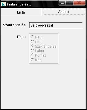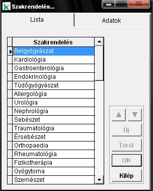 A beutalókhoz és leletekhez használt szakrendelői listát módosíthatjuk ebben a menüpontban. Javítani és törölni csak olyan nevet tudunk, amit mi magunk vettünk fel a listába. Új szakrendelést, vagy kórházat az "új" nyomógombbal vehetünk fel. Ekkor automatikusan az "Adatok" fülre lép a program, ahol a szakrendelés (vagy kórház stb.) nevét és típusát adhatjuk meg. |