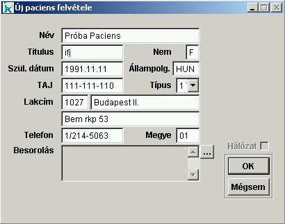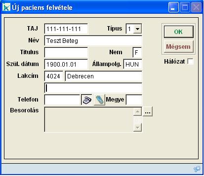 Az ablakban adhatjuk meg az új paciens