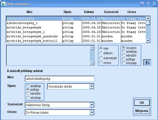 rendeződnek az űrlapok. A rendezési sorrend lehet: név, dátum, szervezet, orvos.