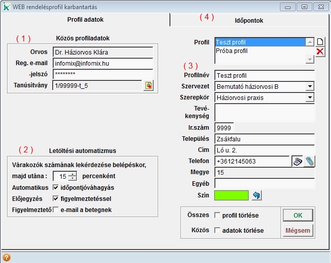 A profil adatait (az ablak jobb oldalán) töltse ki (3), hogy a páciensek az Interneten foglaláskor a lehető legtöbb információ birtokában választhassák Önt. Ha több profilunk is van, akkor minden profilnak külön-külön megadható egy szín. Az adott profil ezzel a színnel jelenik meg a rendszeren belül az Előjegyzési naptárban. Az időpontok fülre átkattintva (4) beállíthatja azt az időszakot, amelyre elfogad Internetes előjegyzéseket. Ez alapesetben megegyezik a naptár karbantartásban kialakított rendelési időkkel. Ha esetleg az Interneten ennek csak egy részét kívánja foglalhatóvá tenni, akkor ennek megfelelően szűkítse az időszakaszokat.